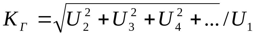 Здесь U1, U2, U3 и т. д. – действующие значения напряжений отдельных гармоник выходного напряжения. Результат не изменится, если в эту формулу подставить не действующие, а амплитудные значения, причем вместо напряжений можно оперировать токами. Иногда используют коэффициенты отдельных гармоник, например второй: KГ2=U2/U1=I2/I1.