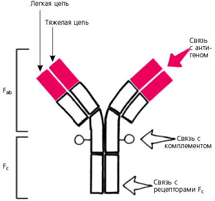 В области Сн2 и СнЗ-доменов располагаются соответственно участок фиксации комплемента и участок, ответственный за фиксацию антитела к клеткам, например к макрофагам, тучным клеткам или лимфоцитам.
