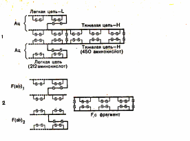 Основная четырехцепочечная структурная единица (мономер) иммуноглобулиновых молекул образована полипептидными цепями двух разных типов. Меньшие по размерам (легкие. L — от англ. light) цепи одинаковы у всех классов, тогда как более крупные (тяжелые, Н — от англ. heavy) цепи структурно различны у разных классов и подклассов иммуноглобулинов.