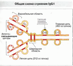 В ней имеется две внутрицепочечные дисульфидные связи в каждой легкой цепи — по одной в вариабельной и константной областях — и четыре таких связи в каждой тяжелой (γ) цепи, которая вдвое длиннее легкой.