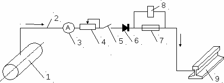 1 - трубопровод; 2 - дренажный кабель; 3 - амперметр; 4 - реостат; 5 - рубильник; 6 - вентильный элемент; 7 - плавкий предохранитель; 8 – сигнальное реле ; 9 – рельс