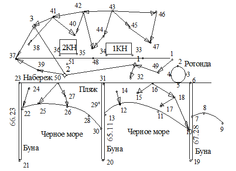 - в процесі тахеометричної зйомки на кожній станції (точки знімального обґрунтування) ведеться схематичне креслення місцевості - абрис. На ньому показуються всі рейкові точки, зняті з даної станції, напрямки слонів і контури ситуації (рис. 6.2). Абрис є дуже важливим польовим документом тахеометричної зйомки.