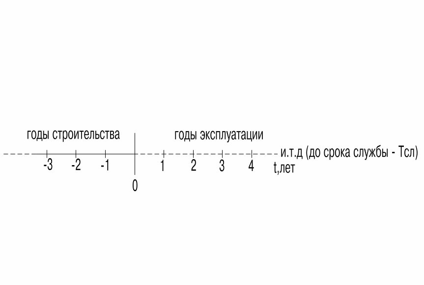 надёжности прогноза показателей горизонт расчёта ограничивается в 15 лет. При сравнении вариантов допускается включение в расчёт только различающихся по вариантам элементов показателей. Соизмерение разновременных показателей осуществляется путём их приведения к начальному периоду сравнения (момент времени t=0 – год окончания строительства или начала эксплуатации объекта) (рис. 1.1).