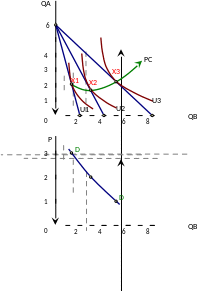 Соединив все точки равновесия, получим кривую «цена-потребление» (PC), которая характеризует «путь» рационального потребителя при изменении цены товара B.