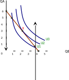 В любой точке кроме X бюджетная линия пересекает кривые безразличия, соответствующие более низкому уровню удовлетворения потребностей. Любая точка над бюджетной линией соответствует более высокой совокупной полезности, но не доступна потребителю.