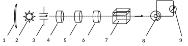 Общий принцип работы. Световой поток от источника 2, отражаемый рефлектором 1, проходит через диафрагму 3 и попадает на систему светофильтров (рисунок 2). Теплозащитный светофильтр 4 поглощает инфракрасные (тепловые) лучи, нейтральный светофильтр 5 поглощает ультрафиолетовое излучение. Цветной светофильтр 6 преобразует полихроматический свет в монохроматический и выделяет узкий участок спектра с определенной длиной волны. Монохроматический свет попадает в кювету 7 с раствором, при этом часть света поглощается. Прошедший через раствор свет поступает на фотоэлемент 8, где энергия света преобразуется в электрическую. Аналитический сигнал измеряют микроамперметром 9.