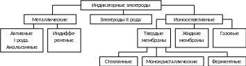 В соответствии с механизмом возникновения или изменения потенциала электроды классифицируются на металлические, электроды II рода и ионоселективные (мембранные) электроды (рисунок 6). Металлические электроды делятся на активные I рода и индифферентные.