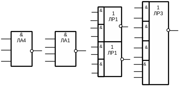 Синтезируемые в процессе выполнения работы схемы должны быть ориентированы при работе со стендом на элементы, имеющиеся на стенде. Это элементы типа ЛА4, ЛА1, выполняющие функцию NИ-НЕ с числом входов N=3 или 4, а также элементы ЛР1, ЛР3, выполняющие функции 2-2И-ИЛИ-НЕ и 2-2-2-3И-ИЛИ-НЕ соответственно. То есть при необходимости выполнения функции НЕ придётся использовать многовходовой инвертирующий элемент типа 3И-НЕ и избавляться от посторонних в этом применении входов. Можно учитывать, что элементы стенда выполнены по технологии ТТЛ. Возникнут проблемы и при необходимости реализации функции ИЛИ. Условные обозначения элементов стенда предложены на рисунке 9. К выходам элементов ЛР1 и ЛР3 имеются инверторы, что позволяет получить логическую функцию без инверсии.