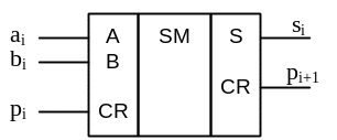 Синтез следует начать с минимизации функции переноса pi как функции трёх переменных: ai, bi, pi. Cумму si следует рассматривать как неполностью определённую функцию четырёх переменных: ai, bi, pi, pi. (попробуйте минимизировать сумму как функцию трёх переменных и сделайте выводы).