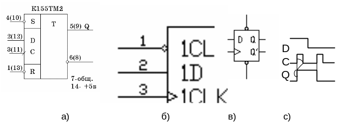 Рис. 23. Условные обозначения D-триггера микросхемы К155ТМ2 (а),