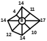 Характеристика маршрута ввода сил ГО автомобильным транспортом (где: 4 - № маршрута; в числителе А- асфальт, Б - бетон, Г - грунтовая дорога; 6 - ширина проезжей части; 14 - общая ширина дорожного полотна в метрах; 80 - длина маршрута в км; в знаменателе: 500 - пропускная способность дороги, машин в час; 12 - количество перевозимого л/с, тыс. чел.; 350 - количество вводимой техники). Знак наносится на пересечении маршрута с границей зоны возможных разрушений. |