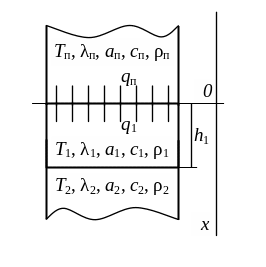 Ограниченный стержень толщиной h1 приведен в соприкосновение с двумя полуограниченными стержнями. Теплофизические свойства стержней различны. В начальный момент времени на свободном конце ограниченного стержня начинает действовать источник тепла постоянной мощности q, который действует на протяжении всего процесса нагрева.