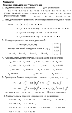 Решение задачи методом контурных токов с помощью программы MathCAD приведено на листинге №2.