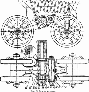 Каждая из таких кареток, играющих важную роль в ходовой части ДТ-75, — это тележка, составленная внутренним и внешним балансирами, которые осью качания соединены друг с другом. Опорные катки попарно установлены на нижних концах балансиров, наверху же балансиры распирает цилиндрическая рессорная пружина.