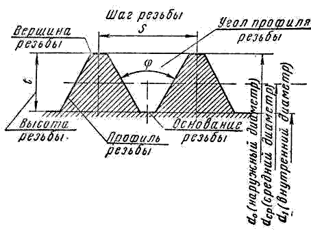Профилем резьбы называется форма сечения витка, проходящего через ось болта или гайки. Ниткой (витком) называется часть резьбы, образуемая при одном полном обороте профиля.