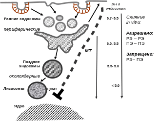 Во-первых, эндоцитозный путь имеет векторную организацию – от мембраны к околоядерной области, – за счет того, что транспорт эндосом происходит по микротрубочкам, наиболее часто организованным в радиальную сеть с центром схождения в околоядерной области (им часто является ЦОМТ, центр организации микротрубочек). Ранние эндосомы располагаются преимущественно на периферии клетки. С течением времени грузы обнаруживаются в более крупных эндосомах, которые находятся в околоядерной области, расположенной в непосредственной близости от центра организации микротрубочек. Таким образом, для появления груза в поздних околоядерных эндосомах необходимы микротрубочки. Предполагалось, что околоядерные эндосомы ― это уже поздние эндосомы и их локализация облегчает взаимодействие с лизосомами, также расположенными преимущественно около ядра, рядом с ЦОМТ.