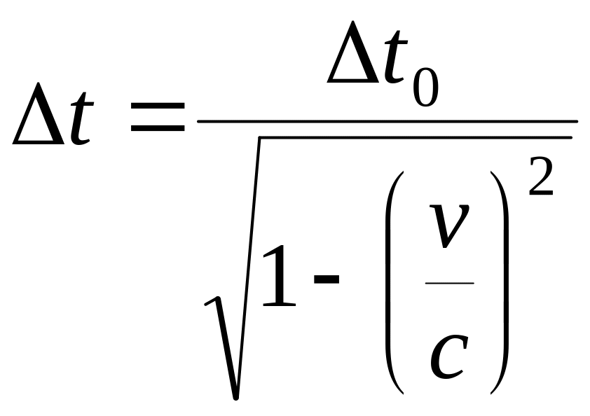 где Δt0 - интервал времени между двумя событиями, происходящими в одной точке системы K', измеренный по часам этой системы (собственное время движущихся часов); Δt - интервал времени между двумя событиями, измеренный по часам системы K.