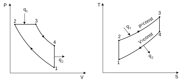 В этом цикле процесс сжатия рабочей смеси происходит по адиабате 1-2. Изохора 2-3 соответствует горению топлива, воспламеняемого от электрической искры и подводу теплоты q1. Рабочий ход поршня осуществляется при адиабатическом расширении продуктов сгорания, изображен линией 3-4. Отвод теплоты q2 осуществляется по изохоре 4-1, соответствующей выхлопу отработанных газов в атмосферу.