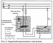 Автоматы защитного отключения тока утечки (рис. 3). Их задача состоит в том, чтобы в случае неисправности в течение 0,2 с отключить все провода на входе нагрузки. Все провода (например, L1, N), идущие от электрической сети к защищаемому прибору, проводятся через суммирующий трансформатор тока. Защитный провод PE не проводится через суммирующий трансформатор тока.