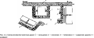 Внутри построечные дороги могут быть сквозными, тупиковыми и кольцевыми. В конце тупиковых должны быть разворотные площадки, а в средней части, при необходимости, разъезды (рис, 4.1).