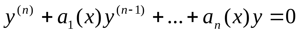 4. Частные решения y1, y2, … , yn уравнения (1) образуют фундаментальную систему решений на (a; b), если ни в одной точке этого интервала вронскиан не обращается в нуль, т.е. W(x) ≠ 0 для всех x (a; b).