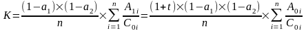 где А1i – прогнозная величина арендной платы для i-го объекта недвижимости; А0i – величина арендной платы для i-го объекта недвижимости на дату оценки; С0i – стоимость i-го объекта недвижимости на дату оценки; а1 – средний рыночный коэффициент недозагрузки объекта недвижимости; а2 – средняя рыночная величина отношения операционных расходов к арендной плате; n – количество объектов недвижимости, по информации о которых осуществляется рыночная экстракция.