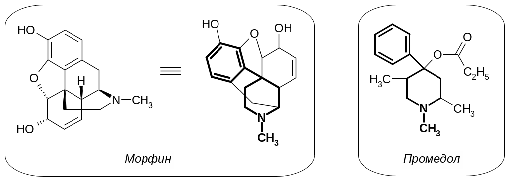 Так, группа важнейших анальгетиков, производных пиперидина, берет свое начало с 1940-х годов, когда на основе изучения взаимосвязи «структура-действие» в ряду морфинановых алкалоидов и идеи упрощения их структуры, был синтезирован промедол. Данный анальгетик по химическому строению может рассматриваться как аналог фенил-N-метилпиперидиновой части молекулы морфина, видоизмененное изображение формулы которого для наглядности приведено ниже в сравнении с формулой промедола (в виде оснований):