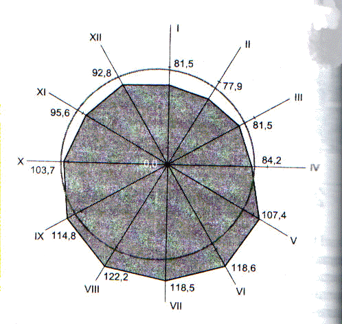 Для построения радиальной диаграммы формируется окружность, и проводятся радиусы по числу месяцев в году (дней недели и т.д.). От центра к периферии на радиусах последовательно откладываются значения сезонных показателей. При превышении среднегодовых показателей кривая выходит за пределы окружности, а при более низких уровнях показателей кривая оказывается внутри окружности. При правильном построении диаграммы площадь поверхности, которая выделена кривой, равна площади круга.