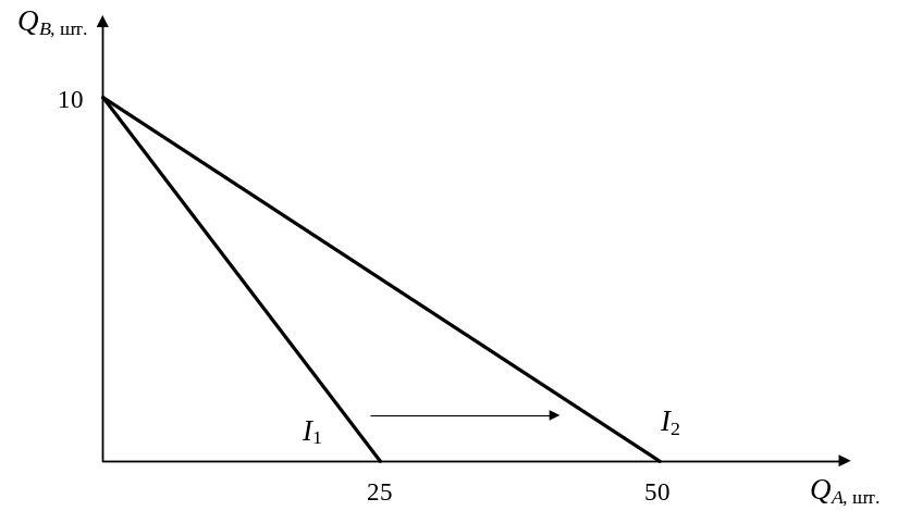 3 Если цена товара А уменьшится в два раза, то есть РА = 2 ден. ед. за шт., то потребитель на свой доход 100 ден. ед. сможет купить 50 шт. товара А, следовательно, линия бюджетных ограничений примет вид I2 (рисунок 2.3):