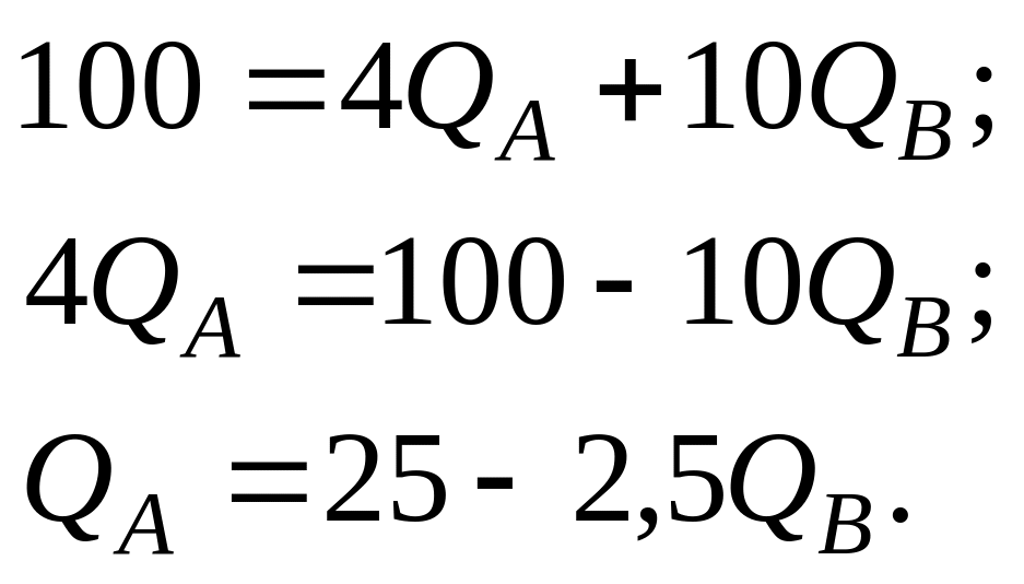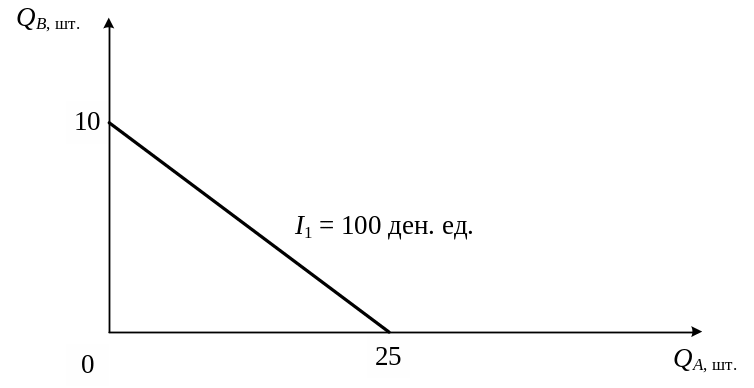 1 Рассмотрим точку пересечения бюджетной линии и горизонтальной оси (см. рисунок 2.2), в этой точке весь доход израсходован на 25 шт. товара А, так как количество товара QB = 0. Следовательно, цена товара