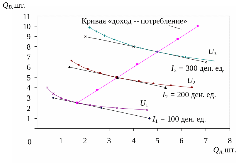 Например, если бы потребитель потратил весь свой доход на набор 7А + 4Б + 6В, то суммарная полезность его составила бы 43 + 78 + 60 = 181, что меньше максимизирующего 184.