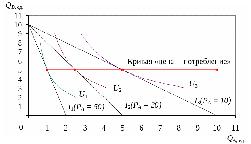 На основании зависимости QA(PA) построим кривую «цена – потребление» по точкам, последовательно изменяя цену на благо A, например P1 = 50, P2 = 20, P3 = 10 ден. ед. (порядок выбора цены на первое благо не имеет значения).