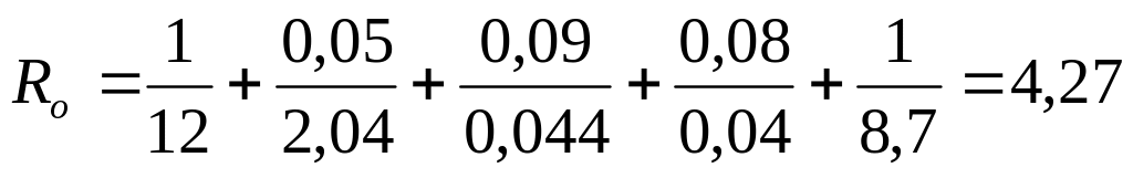 Сопротивление теплопередаче по глади стены рассчитывается по формулам (Е.6), (Е.7) приложения Е СП 50.13330.2012. В данном случае оно составляет: