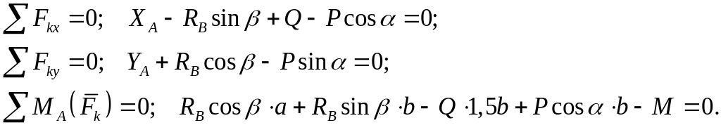 Для определения трех неизвестных реакций связей составляем уравнения равновесия: