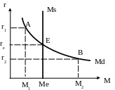Высокая процентная ставка, соответствует низкому курсу облигаций, поэтому будет выгодно скупать дешевые облигации в расчете на доход от повышения их курса в будущем вследствие снижения r. Банки и другие финансовые учреждения в условиях превышения предложения денег над спросом начнут снижать процентные ставки. Постепенно через изменение экономическими агентами структуры своих активов и понижение банками своих процентных ставок равновесие на рынке восстановится.