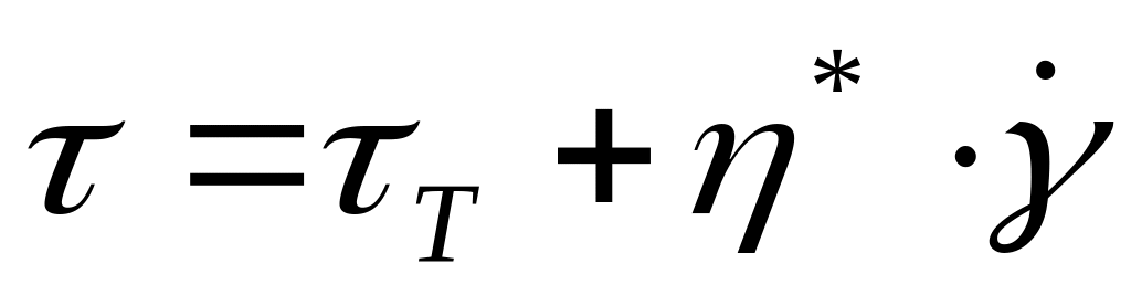 Напряжение τ состоит из двух составляющих: напряжения, необходимого для разрушения структуры и называемого пределом текучести, и напряжения (τ - τТ), осуществляющего собственно течение. Величина η* называется пластической вязкостью. Графически она определяется котангенсом угла наклона прямой, выходящей из точки, соответствующей пределу текучести. По физическому смыслу ньютоновская вязкость η отличается от пластической вязкости η*. Между ньютоновской и пластической вязкостью существует соотношение, которое получается комбинированием уравнения Ньютона и Бингама
