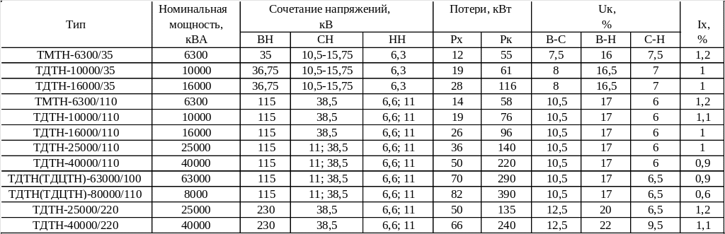 Примечания: 1. Трансформатор ТМТН-6300/35 имеет РПН на стороне ВН 6х1,5%, СН и НН без ответвлений