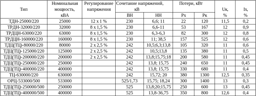 Примечание: 1. Трансформаторы ТМН-2500 и 6300 имеют РПН на стороне НН, у остальных трансформаторов РПН в нейтраль ВН.
