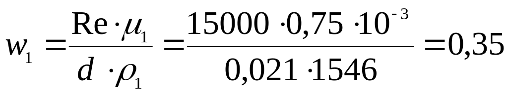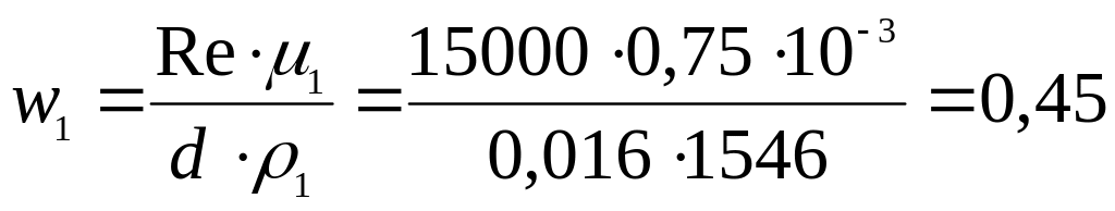 Чотирихлористий вуглець направимо в трубний простір, воду – в міжтрубний простір. Приймемо орієнтовно значення Re (15000), що відповідає розвиненому турбулентному режиму течії в трубах. Тоді в трубах теплообмінника 252 мм швидкість течії чотирихлористого вуглецю повинна бути: