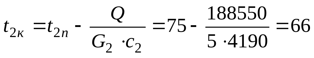 2. Визначення кінцевої температури гарячого теплоносія (води) з рівняння теплового балансу: