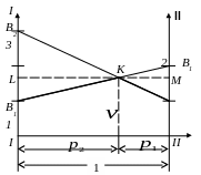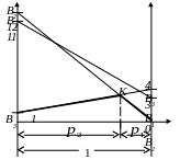 Решение. Построим график, где слева отложим значения проигрышей второго игрока при использовании им первой стратегии, а справа – значения проигрышей второго игрока при использовании им второй стратегии.