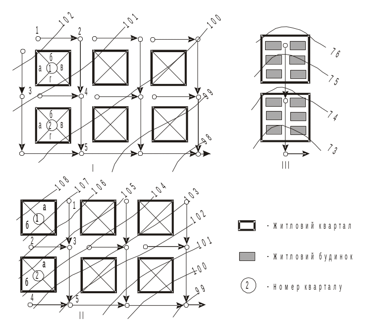 Черезквартальне трасування (рис. 1, III) використовується для багатоповерхової зони забудови для кварталів, що розташовані у тальвегах балок, при наявності проекту детального планування забудови кварталів.