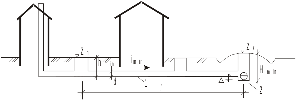 де imin – мінімальний похил трубопроводу внутрішньої квартальної мережі (діаметр внутрішньої квартальної мережі 150 мм, тоді imin = 0,008 [5, п. 8.5.1]); l – довжина квартальної мережі (рис. 2), м; zп, zк – позначки поверхні землі відповідно на початку і в кінці квартальної мережі (рис.2), м; Δ – різниця відміток лотків внутрішньо-квартальної та вуличної мереж у точці їх з’єднання, м; hmin – мінімальна глибина закладання трубопроводу на початку внутрішньої квартальної мережі, м, яку визначають за найбільшим значенням з отриманих за двома умовами: