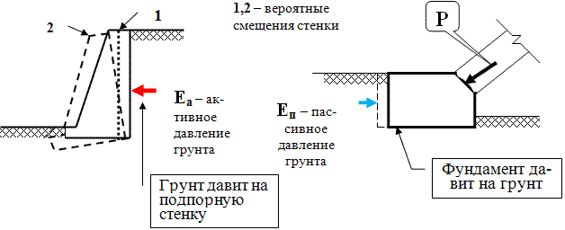 Давление грунта, передаваемое призмой обрушения на грань стенки, носит название активного давления Еа. При этом подпорная стенка смещается в сторону от засыпки. Если же подпорная стенка смещается в сторону грунта, то грунт засыпки будет выпирать вверх. Стенка будет преодолевать вес грунта призмы выпирания, что потребует значительно большего усилия. Это соответствует пассивному давлению (отпору) грунта Ер.