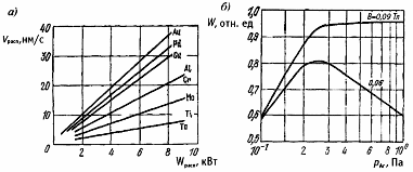 Важным параметром разряда, определяющим скорость распыления, является электрическая мощность, причем скорость осаждения пленки почти линейно зависит от приложенной мощности (рис. 7.4а). В свою очередь, мощность разряда при постоянной мощности источника зависит от р и В.