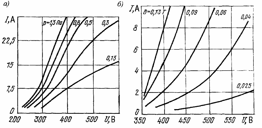 Существенное влияние на вид вольт-амперной характеристики оказывают рабочее давление и индукция магнитного поля В.