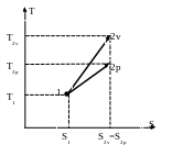 Отличие от изохорного процесса состоит в том, что в знаменателе показателя степени экспоненты находится изобарная теплоёмкость. Т.к. она меньше изохорной, то показатель экспоненты в изобарном процессе меньше показателя экспоненты для изохорного процесса. Это значит, что график изохорного процесса в T-S диаграмме идёт «круче» графика изобарного процесса (на рис. 22 изохорный процесс изображён линией 1-2v, а изобарный – линией 1-2р). Этот факт можно обобщить и утверждать, что изохорный процесс в любой области T-S диаграммы идёт «круче» изобарного.