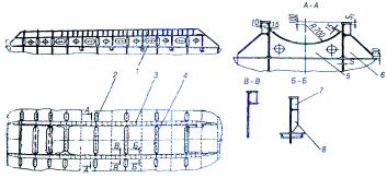 На эти планки привариваются платики, создающие опорную поверхность для фундаментной рамы двигателя. Опорные планки устанавливаются на продольные балки поз. 1, которые скреплены деталями жесткости 2, 4-8. Бракеты 5 имеют вырез для размещения картера двигателя.