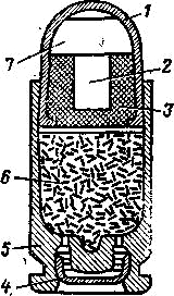 1-біметалева оболонка; 2-сталевий сердечник; 3-свинцева сорочка ; 4-капсуль; 5-гільза; 6-пороховий заряд; 7-куля