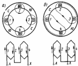 Cпособ осуществляет ступенчатое изменение частоты вращения. Отдельные катушки 1, 2 и 3, 4, составляющие одну фазу, переключаются так, чтобы изменялось соответствующим образом направление тока в них (например, с последовательного согласного соединения на встречное). При согласном включении катушек (а) число полюсов равно четырем, при встречном включении (б) — двум. Катушки двух других фаз, сдвинутые в пространстве на 120°, соединяются таким же образом. Такое же уменьшение числа полюсов можно осуществить при переключении катушек с последовательного на параллельное соединение. При изменении числа полюсов изменяется частота вращения n1 магнитного поля двигателя, а следовательно, и частота вращения n его ротора. Если нужно иметь три или четыре частоты вращения n1, то на статоре располагают еще одну обмотку, при переключении которой можно получить еще две частоты.